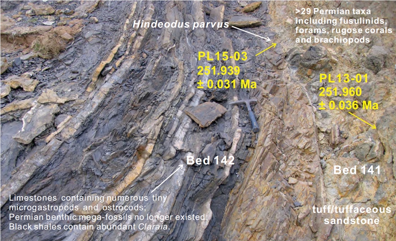 距今约2.5亿年前的二叠纪末生物大灭绝,是地球生命历史中最具灾难性的生物灭绝事件,造成90%以上的海洋生物和约75%的陆地生物灭绝。过去二、三十年来关于这次大灭绝的研究,很多以浙江长兴煤山、四川广元上寺等经典地层剖面为研究对象,并取得了一系列重要进展,但上述剖面都存在一个明显的缺陷,即地层异常凝缩。以煤山剖面为例,生物大灭绝事件从开始到结束的整个过程,仅保存在约36厘米的地层中,而且可能存在多个沉积间断。