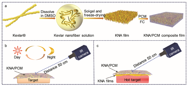 图1、凯夫拉纳米纤维气凝胶薄膜的制备、与相变材料的复合及其隐身结构示意图