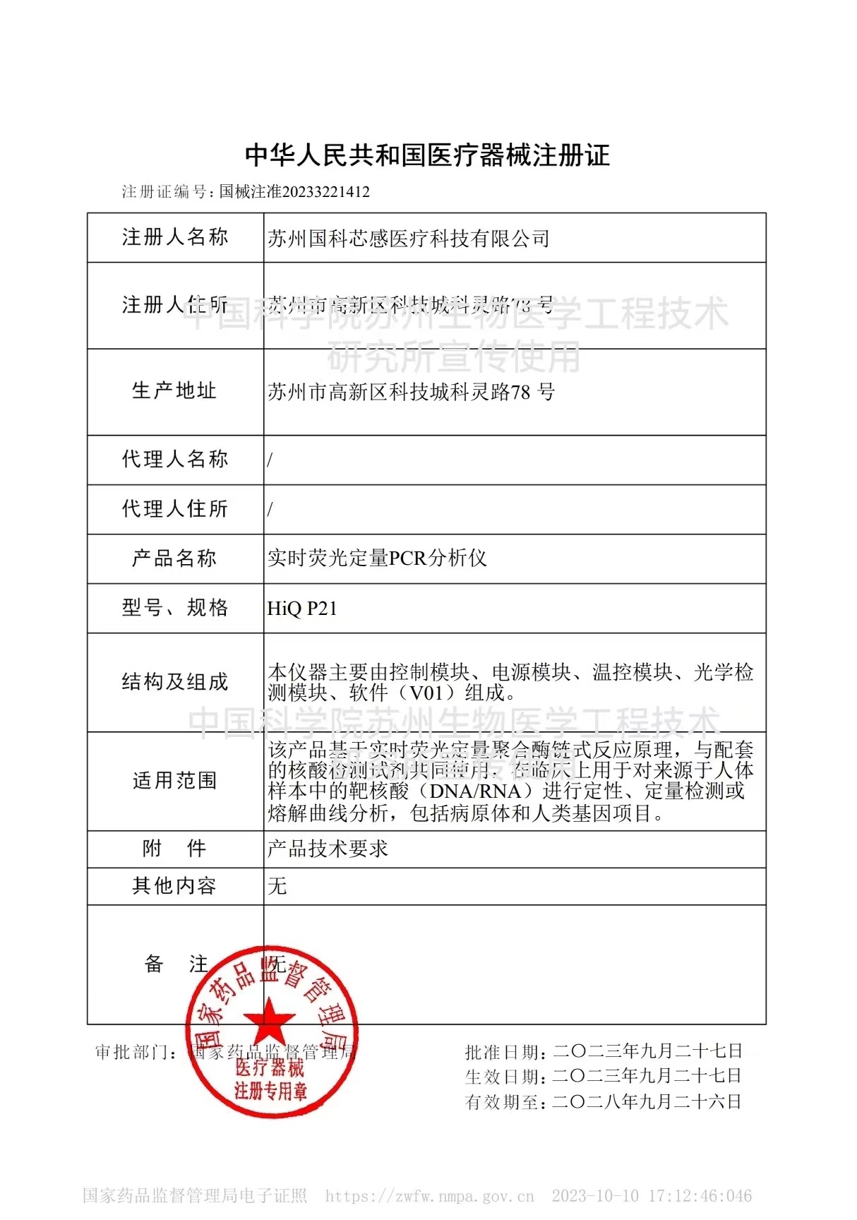 近日,由中国科学院苏州生物医学工程技术研究所联合苏州国科芯感医疗科技有限公司研发的多重核酸检测技术成果——HiQ P21实时荧光定量PCR分析仪,正式获得国家药品监督管理局三类医疗器械注册证(注册证编号:国械注准20233221412)。